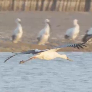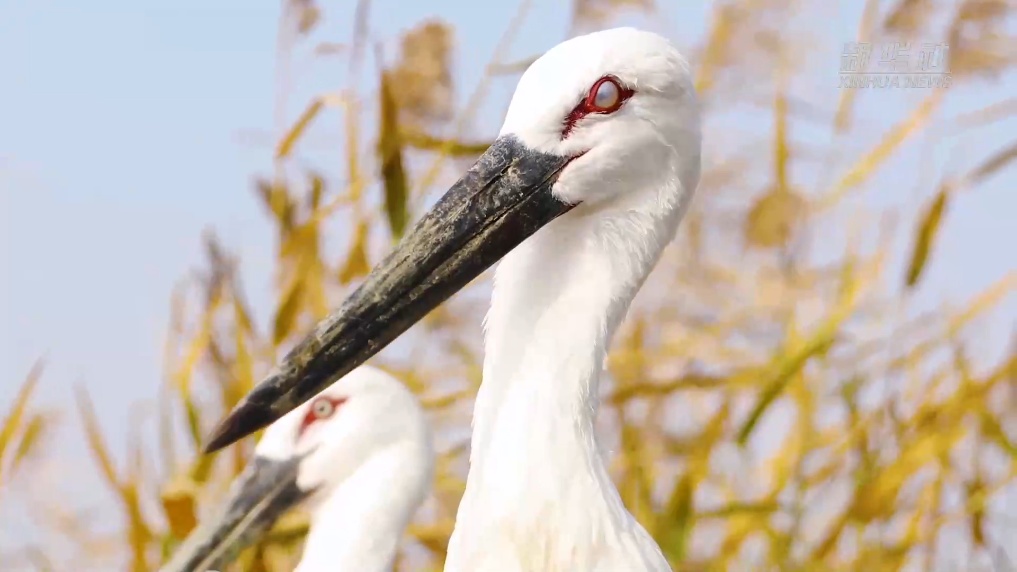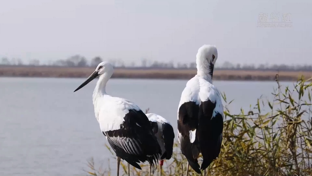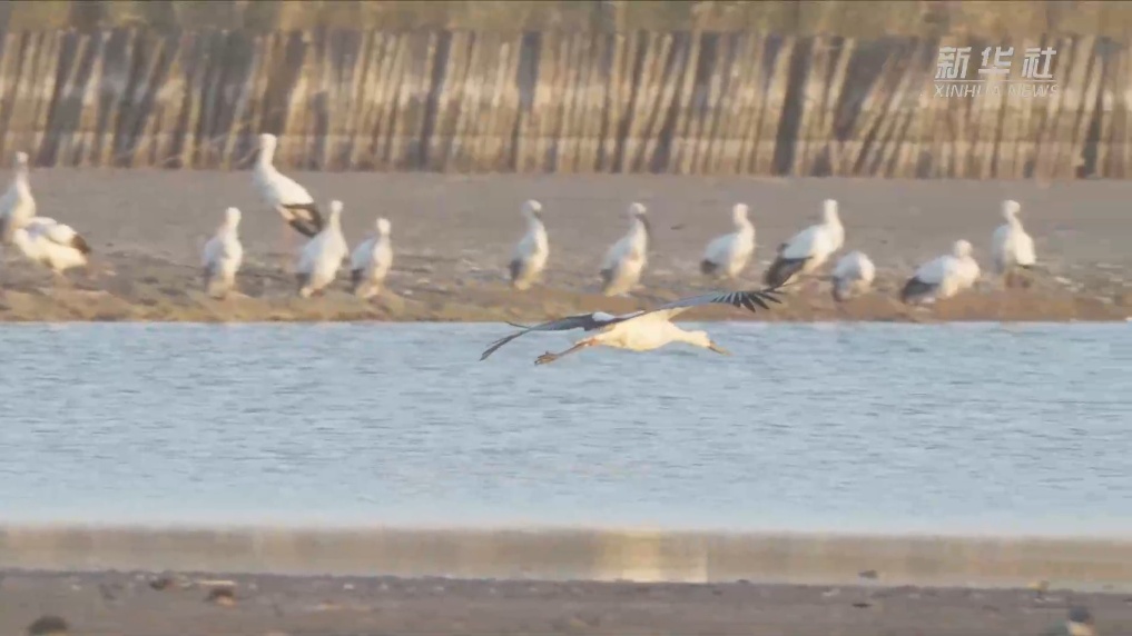眼下,伴随着大量候鸟南迁,2022年放飞的三只东方白鹳陆续飞回,在天津市滨海新区的滩涂湿地停留补给。