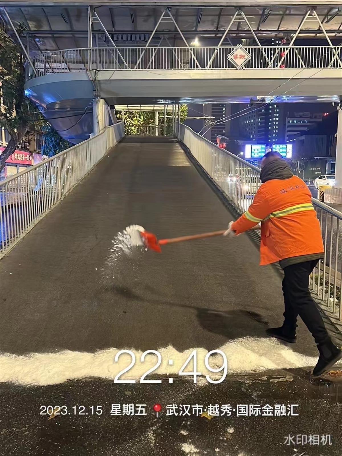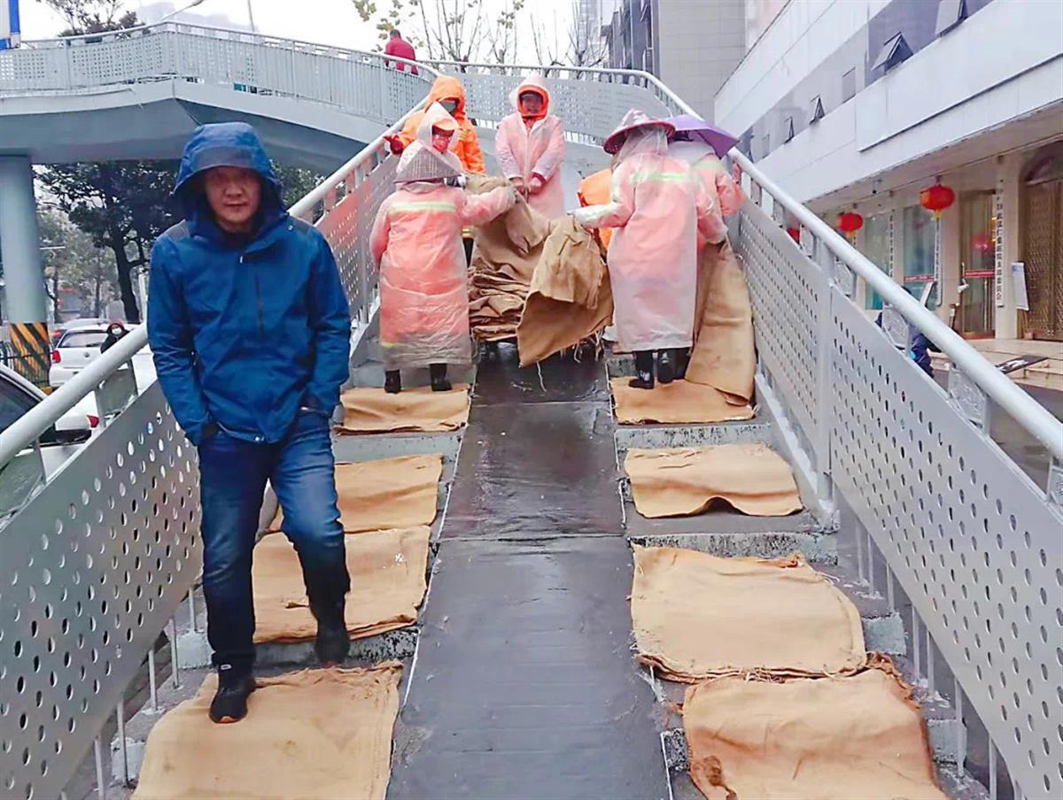 硚口区连夜对长丰高架、二环线、三环线、硚孝高速(硚口段)汉江湾桥、古田桥等环线上下匝道喷洒融雪剂15余吨;对主次干道、高架桥迎风面、阴面等易冻结、积雪的区域,安排专人铲雪;对辖区内桥梁步梯、商户密集区域的非机动车道以及公厕出入口等部位铺垫了5000条麻袋,责停了20余家洗车店湿路致滑行为。