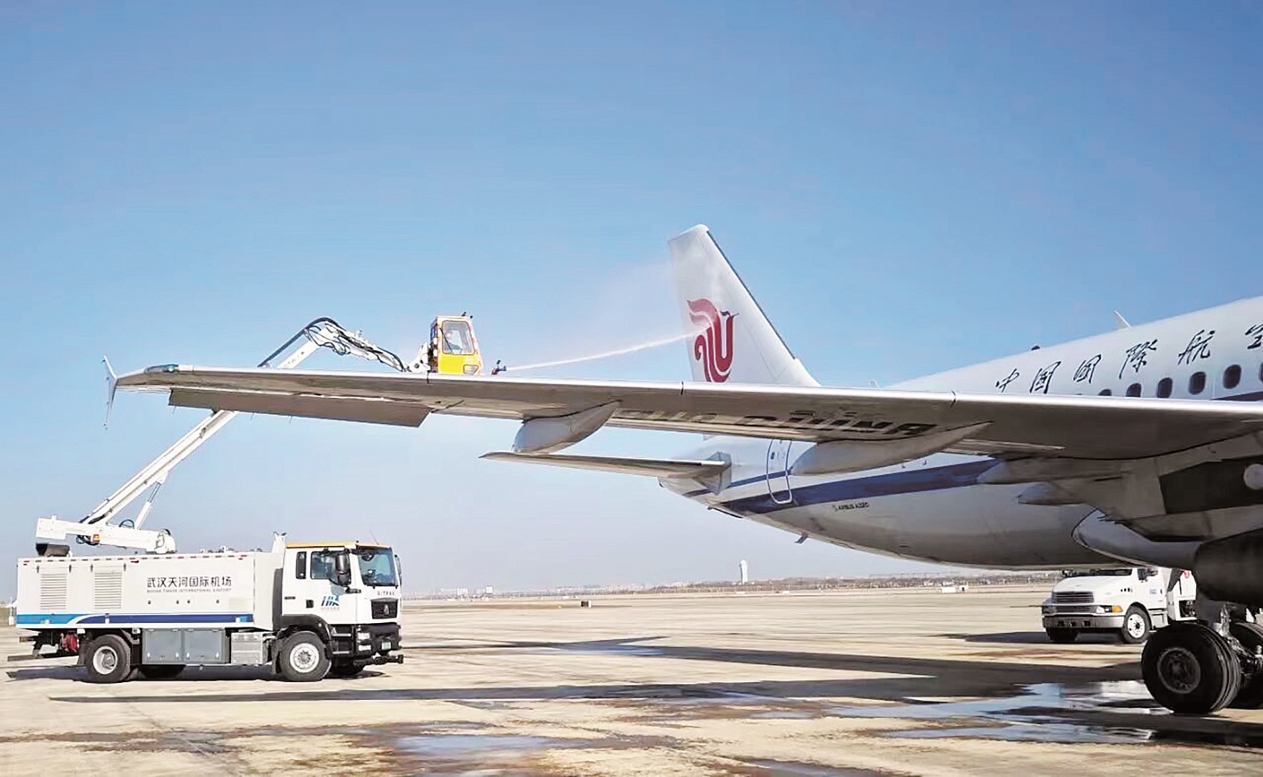 12月16日凌晨,武汉天河机场迎来了今冬首场降雪。截至16日15时30分,武汉天河机场已累计完成航班除冰作业2架次,共执行航班266架次。