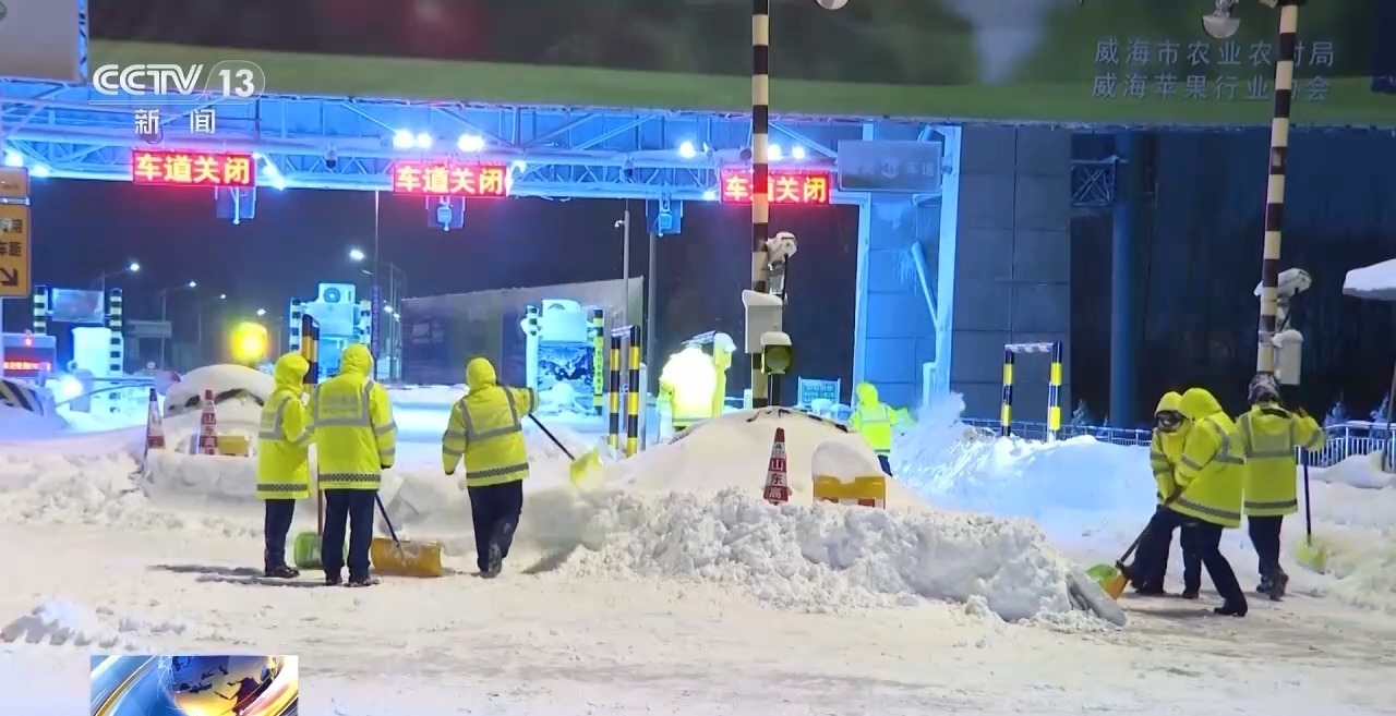 总台央视记者 王善涛:由于连续降雪,荣乌高速的威海收费站临时封闭,这里的积雪目测至少有五十厘米。