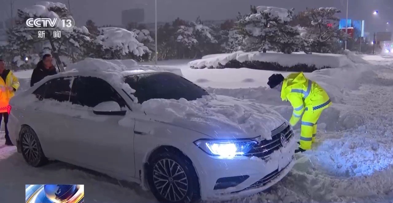 梯形车队出发后,留在收费站广场的张辉,组织人员对抛锚的车辆进行救援。气温逐渐下降,大家的帽子、外套上也很快被飘落的雪花染白。从收费站往市区方向的主干道旁,有好几辆车因雪大、路滑无法行动,不一会儿就被白雪覆盖。
