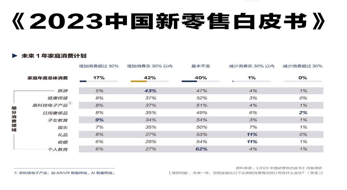 本次调研数据显示,41%的受访者表示他们的消费需求并未收缩,但消费结构会根据需求变化进行调整。超过四成受访者表示2023年以来家庭年收入较去年同期有所增加。其中59%的受访者表示会在未来一年增加家庭年度总消费,相比2022年增加了2.6个百分点。