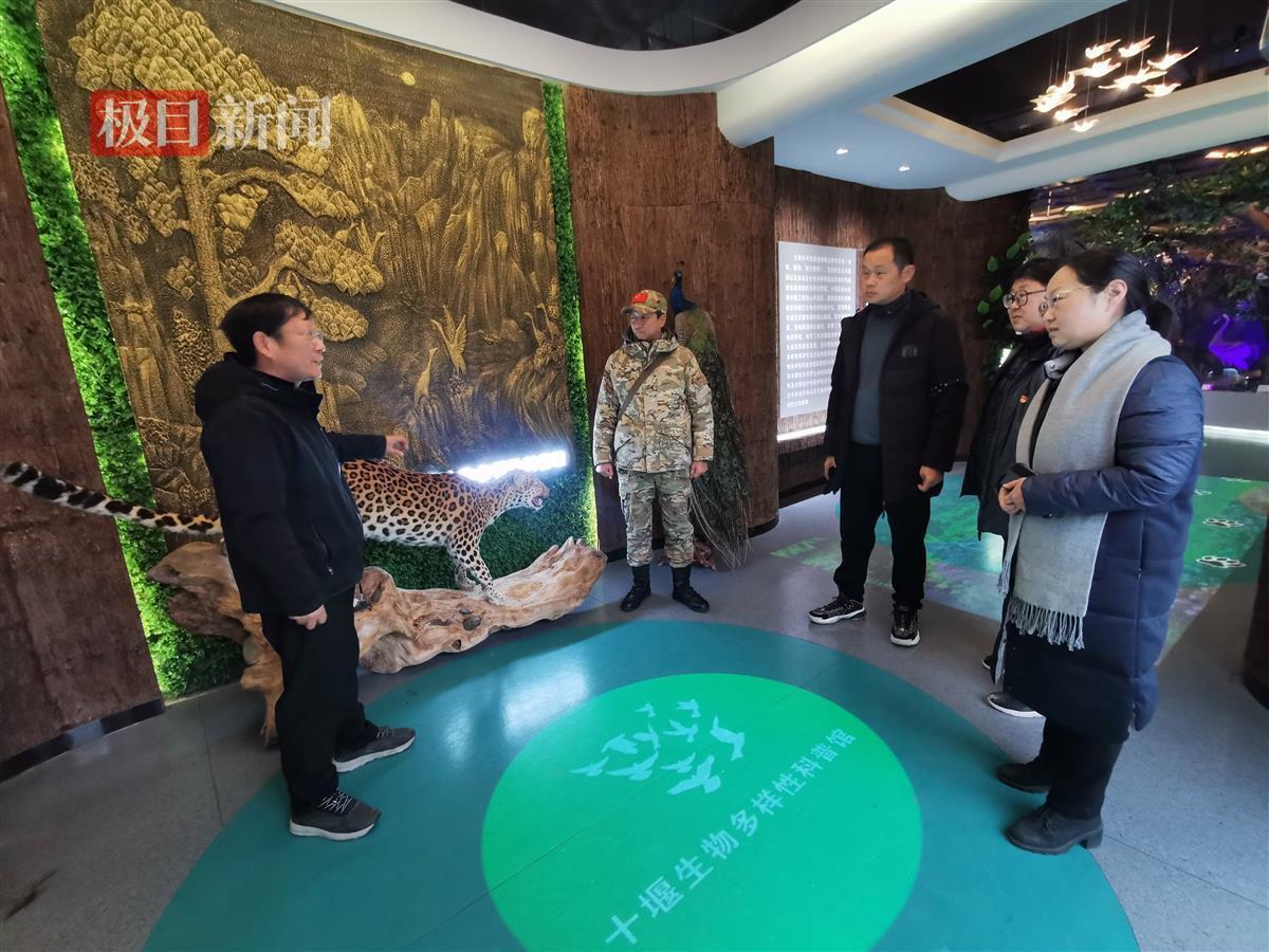 十堰市野保站站长雷波向师生介绍了生物多样性科普馆的五大功能区和相关陈列的动植物标本。参观过程中,馆内珍稀的羚牛、金钱豹等国家一级保护动物标本吸引了师生的目光,他们一边参观,一边向野保工作人员询问动物习性。