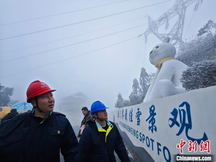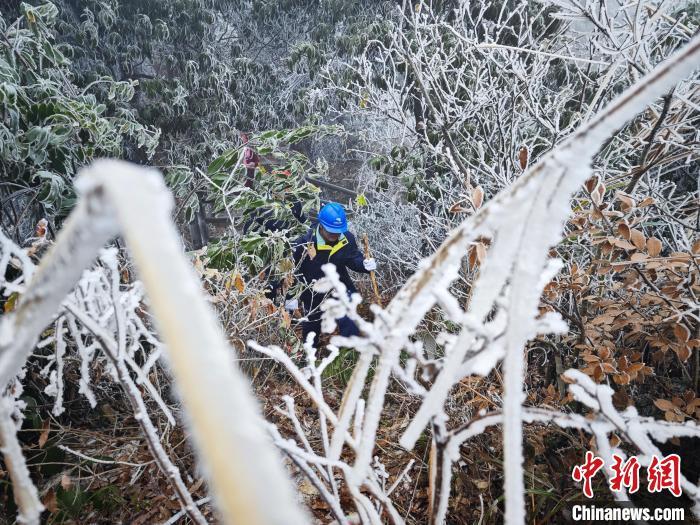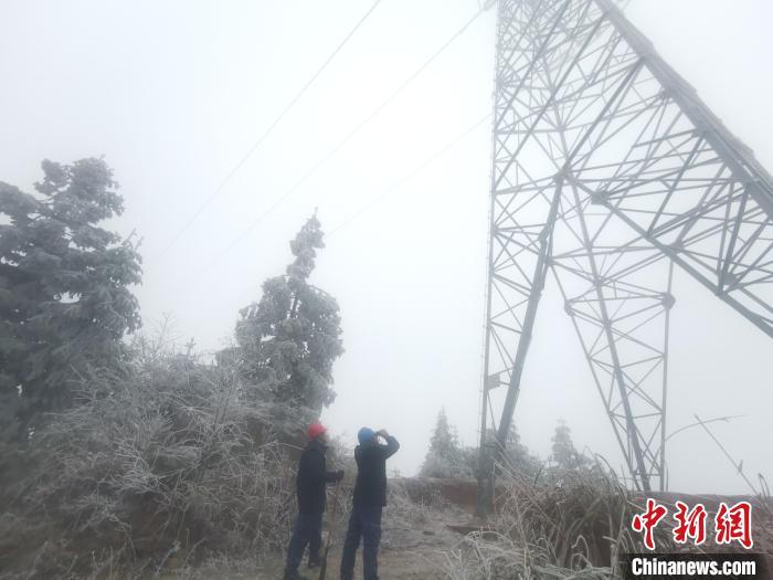 图为南方电网广西桂林供电局工作人员,在观察高山线路覆冰情况。 陈伯鑫 摄