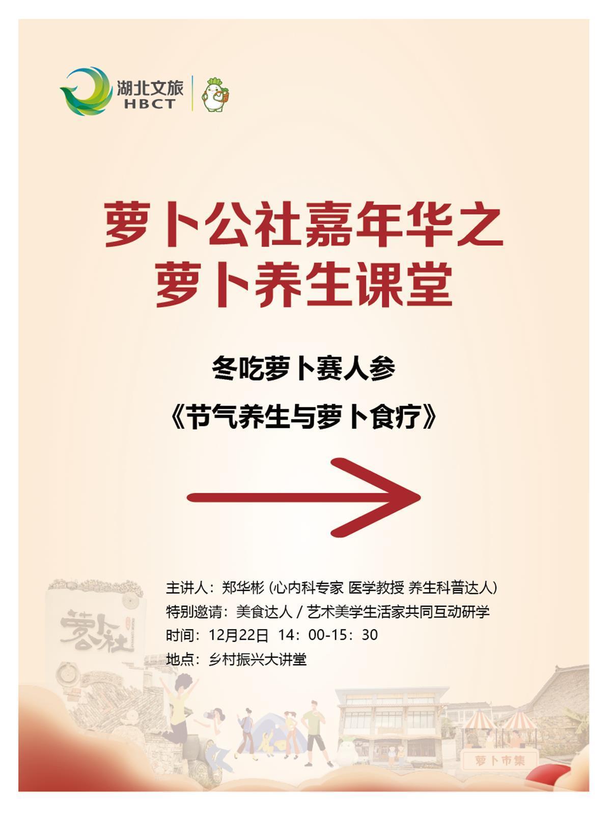独具特色的萝卜市集,严选了当地的农产品、特色小食、萝卜文创产品,特产桂花糕、咸宁桂花、莲蓬等,各种丰富的品类将呈现出不一样的市集文化。特邀美食达人、艺术美学生活家的萝卜养生课堂,将由心内科专家、医学教授、养生科普达人郑华彬以“冬吃萝卜赛人生”为引子,开展《节气养生与萝卜食疗》为主题的养生讲座。还有沉浸式“寻找仙萝”、皮影戏、保卫萝卜、诗词长廊等各种亲子趣味类活动,通过游戏打卡获得“萝币”,还可兑换各种惊喜小礼品。
