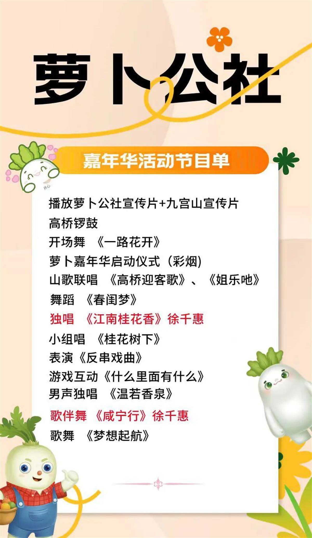嘉年华活动启动现场,武汉歌剧舞剧院歌唱演员徐千惠,将精彩演绎她的代表作《江南桂花香》,唱响咸宁人熟悉的歌声“玫瑰香,茉莉香,比不上江南的桂花香”。闻名于咸宁的萝卜宴,将以萝卜为主要食材,让游客们品味典型的鄂南宴席。16道菜,以白水仙萝贯穿其中,包括2个冷盘、4个大件、6个中件、2个汤品、2个小食,冷热、荤素、甜咸、酸辣兼而有之。