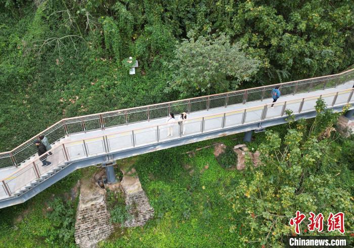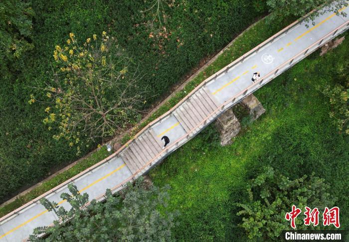 图为航拍市民行走在“悬空”步道上感受慢行交通系统。中新网记者 周毅 摄