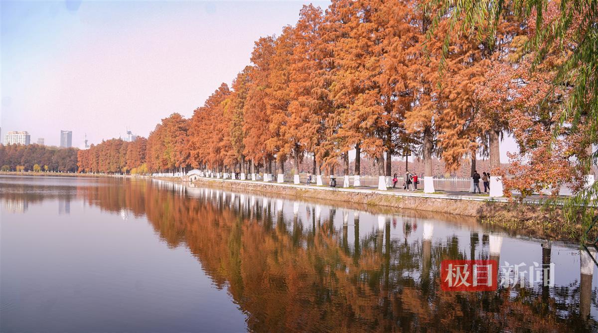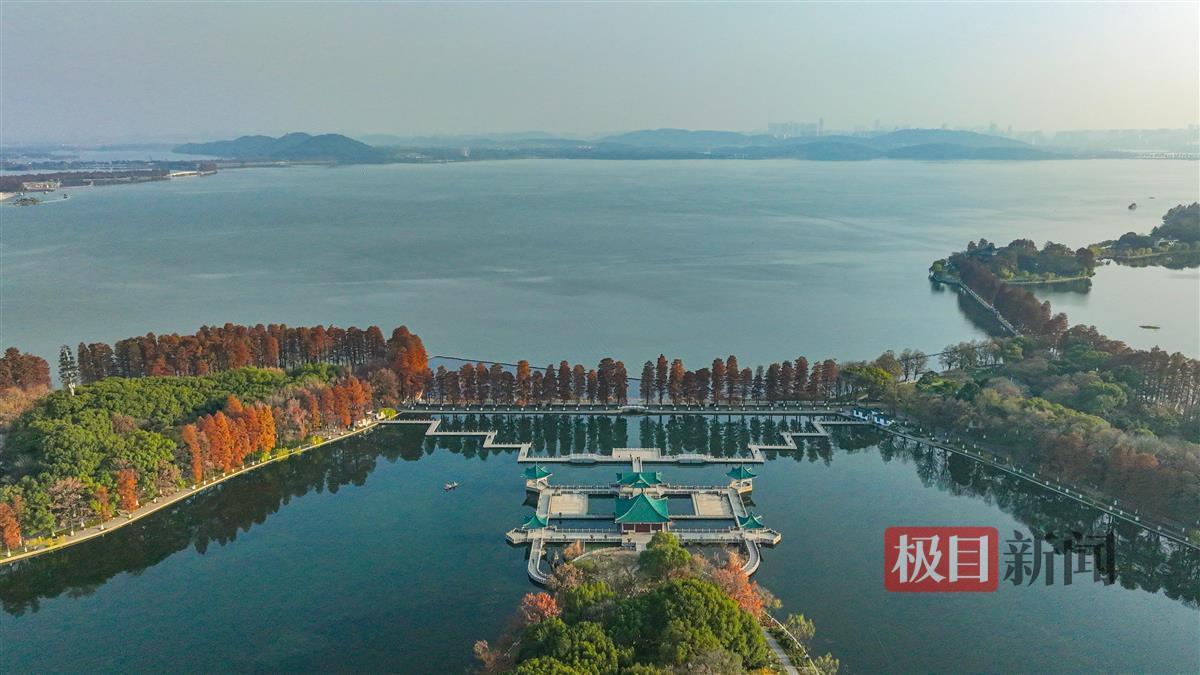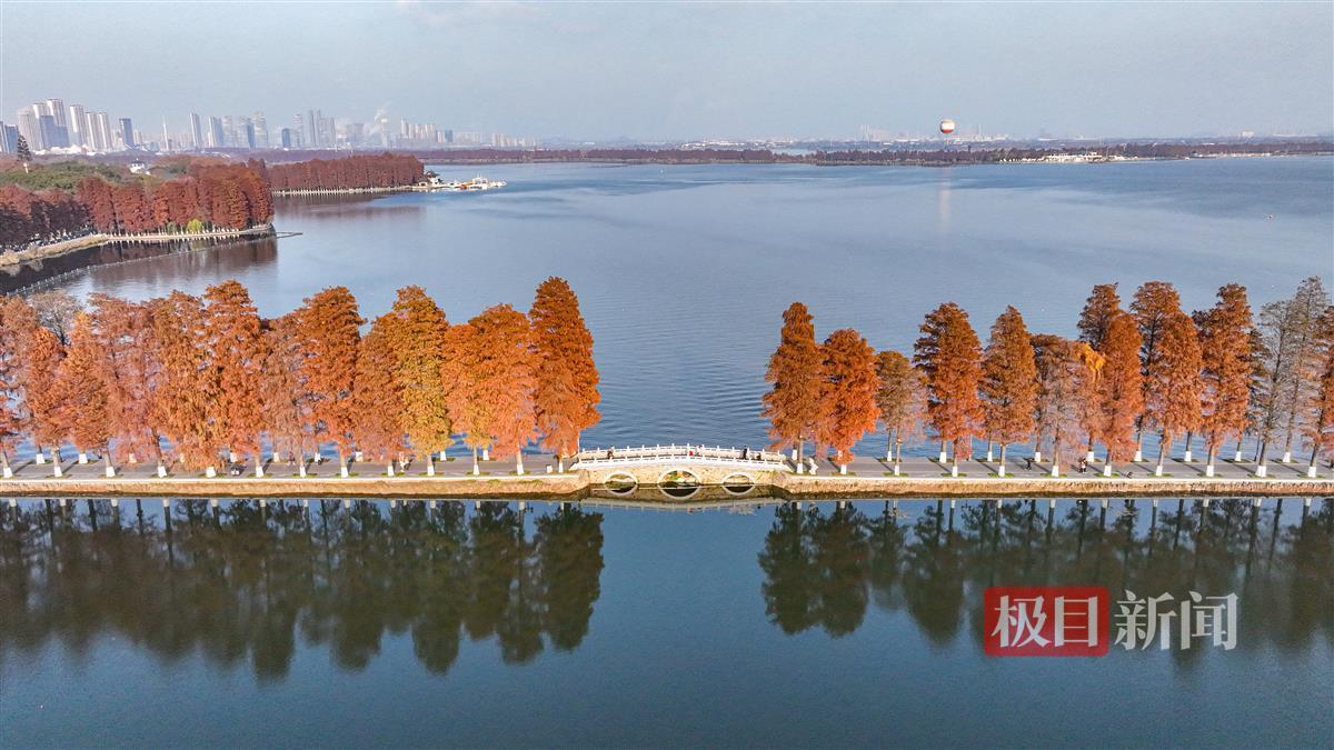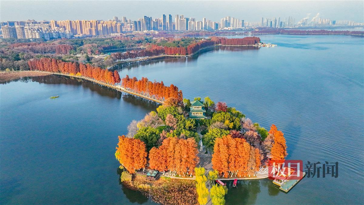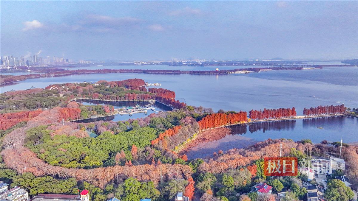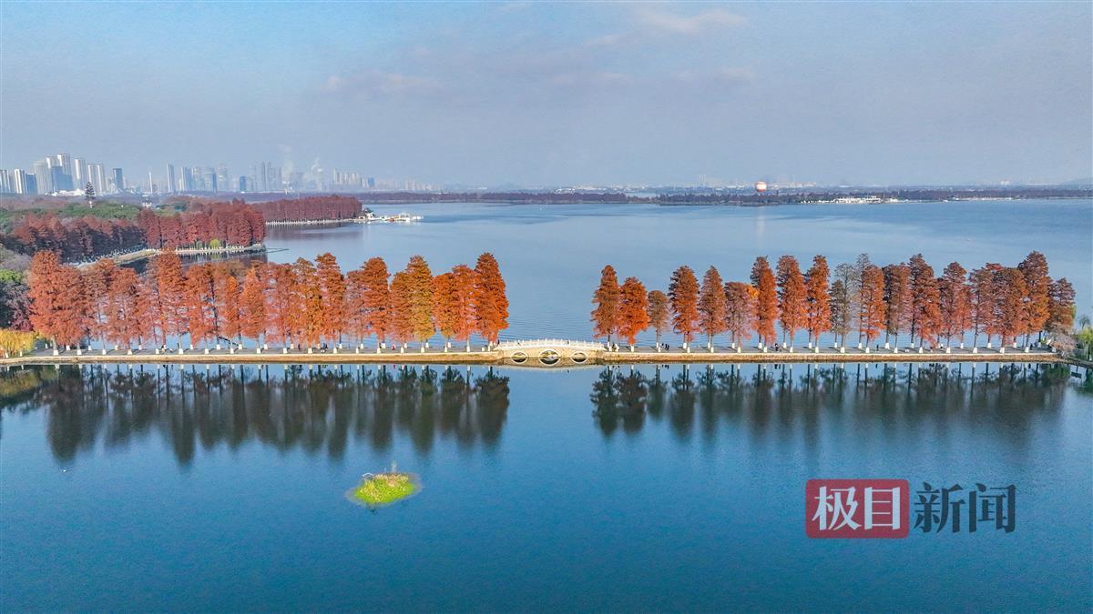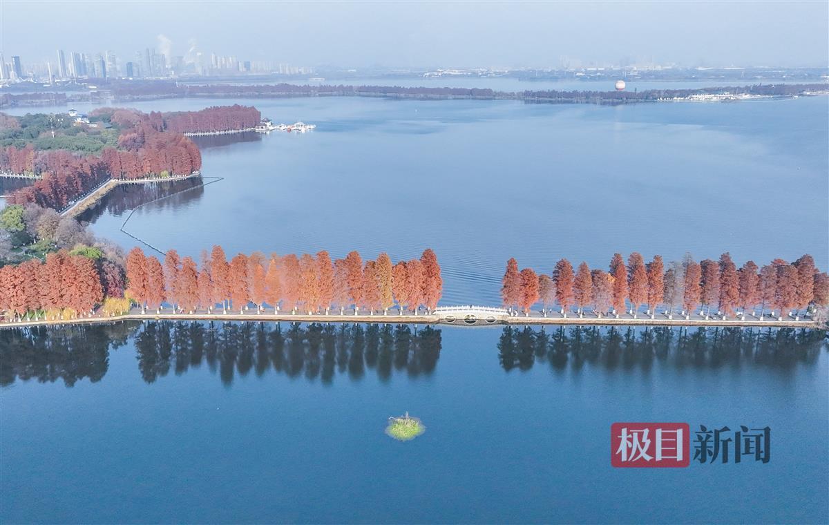 东湖红杉林被这波入冬以来最冷的风霜染得透红,呈现着一年中最艳丽的颜色。红艳艳的树叶在阳光的照耀下更加夺目,倒映在如蓝如黛的清澈湖水间,愈发秀美。一棵棵红杉蜿蜒长堤,勾勒出武汉东湖一年之中最美的时刻,惊艳了冬天。