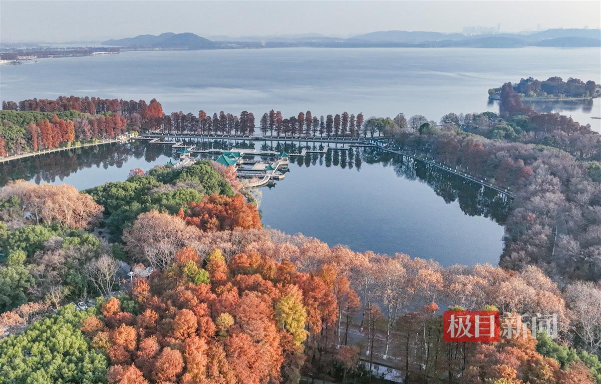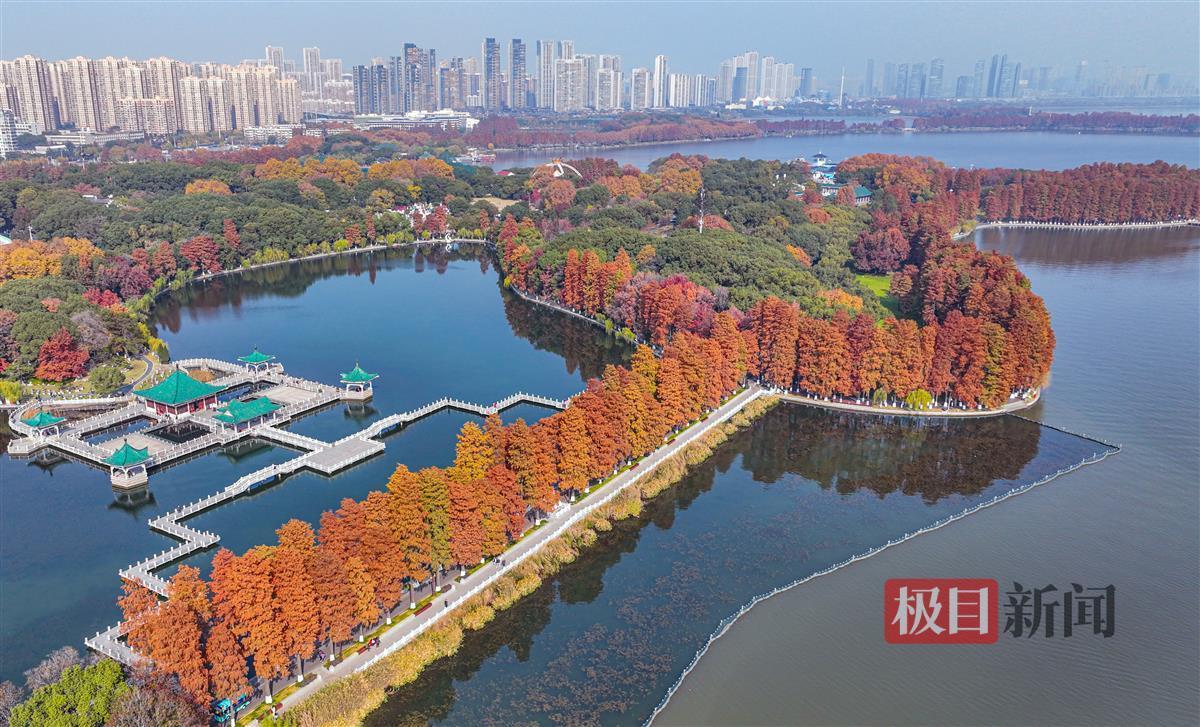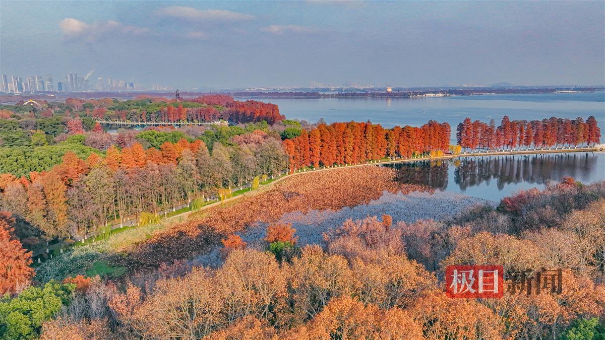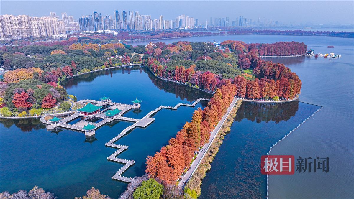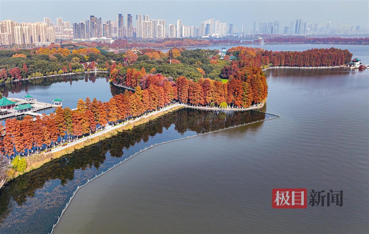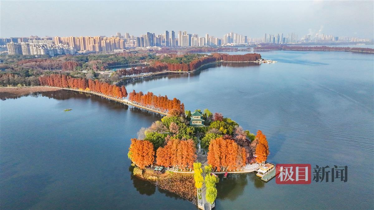 东湖红杉林被这波入冬以来最冷的风霜染得透红,呈现着一年中最艳丽的颜色。红艳艳的树叶在阳光的照耀下更加夺目,倒映在如蓝如黛的清澈湖水间,愈发秀美。一棵棵红杉蜿蜒长堤,勾勒出武汉东湖一年之中最美的时刻,惊艳了冬天。