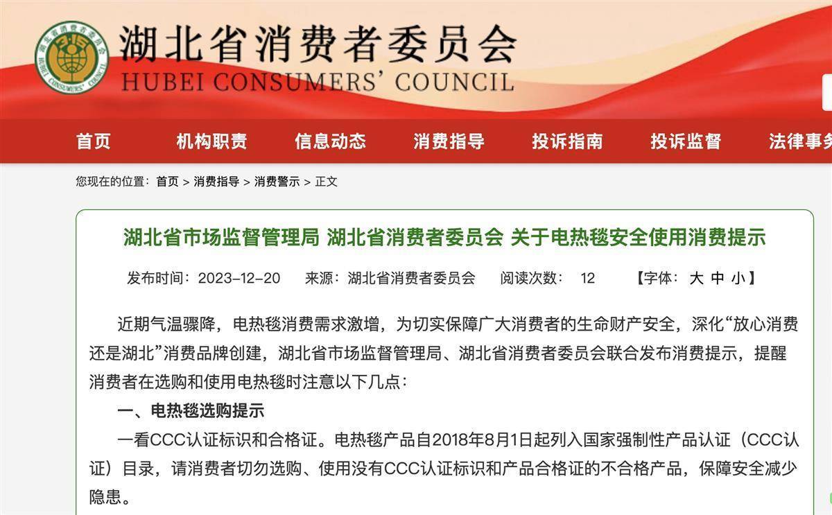 近期气温骤降,电热毯销量激增。12月20日,省市场监管局和省消委联合发布《关于电热毯安全使用消费提示》,帮助广大消费者选购安全优质的电热毯。