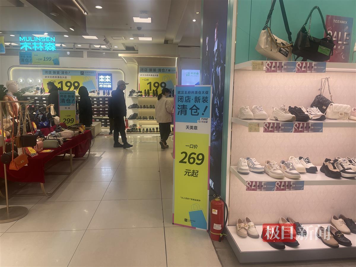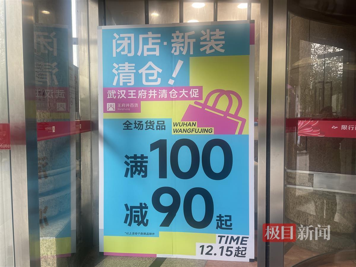 12月20日,极目新闻记者在武汉王府井百货看到,商场外围并没有贴出闭店的相关公告。但商场入口处,贴上了一张大幅宣传海报,上面写着“12月15日起闭店新装、清仓大促,全场货品满100减90起”。商场内部从1楼至6楼,几乎每一层楼都贴上了“清仓大促”的海报。有的护肤品牌“满300减60”,有的鞋类品牌做起了一口价,有的珠宝品牌黄金每克减100元,有的服饰“满100减50”。