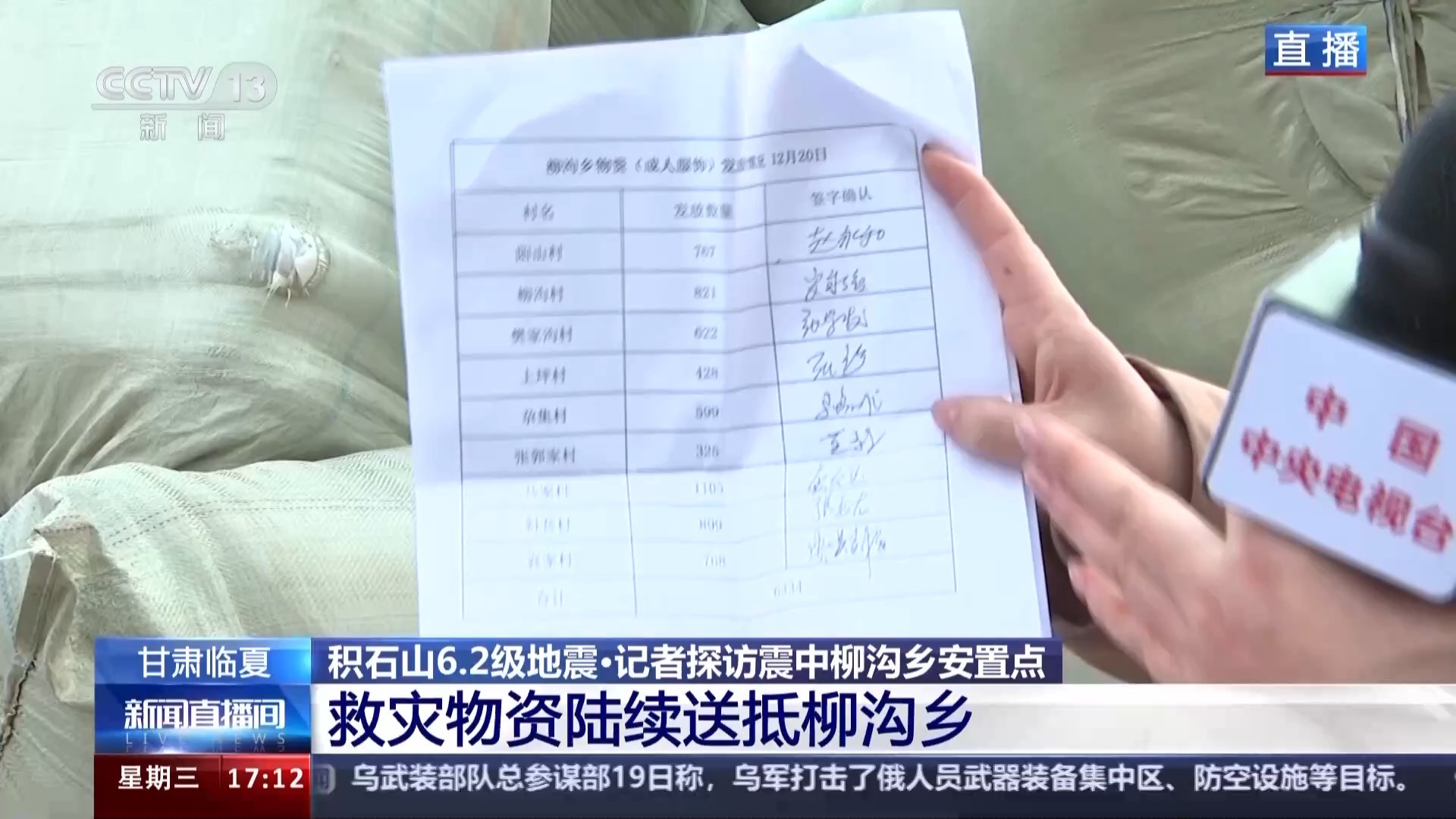 总台记者 王妍:为了让这些物资能够快速发放给群众,现场工作人员分了组,有专门来接收物资的,也有统计、发放物资的。在现场还有一些小型的小货车和农用的三轮车,这些物资在经过盘点之后就会送到这些小车上,拉到柳沟乡的临时安置点中。