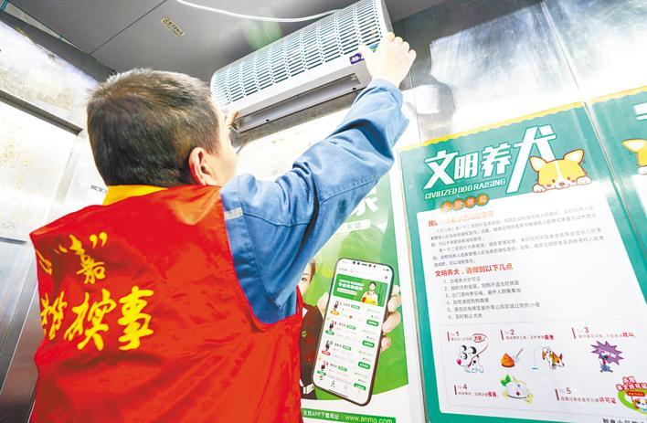 图为列电小区物业工作人员检修电梯里的卧式电扇。(湖北日报全媒记者 魏铼 摄)