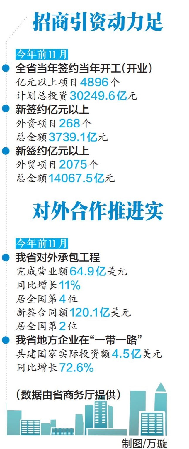 省商务厅提供数据显示,今年前11月,我省对外承包工程完成营业额64.9亿美元,同比增长11%,居全国第4位;新签合同额120.1亿美元,居全国第2位;我省地方企业在“一带一路”共建国家实际投资额4.5亿美元,同比增长72.6%。