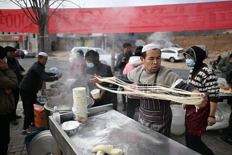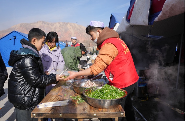 12月20日,在积石山县大河家镇大河村安置点,爱心企业给受灾群众提供免费牛肉面。新华社记者 陈斌 摄