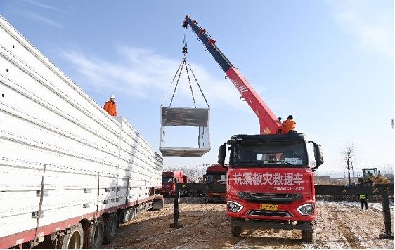 12月21日,在积石山县大河家镇梅坡村,施工人员搭建活动板房。新华社记者 范培珅 摄