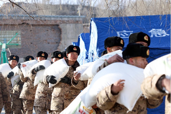 12月21日,武警甘肃总队临夏支队官兵在积石山县刘集乡阳屲村为受灾群众搬运面粉。新华社发(侯崇慧摄)