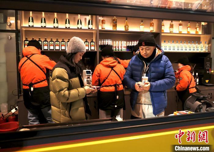 图为sunside餐厅老板张龙(右二)和刘雨(左二)在位于滑雪场雪山脚下的分店处理店内事务。 中新社记者 易海菲 摄