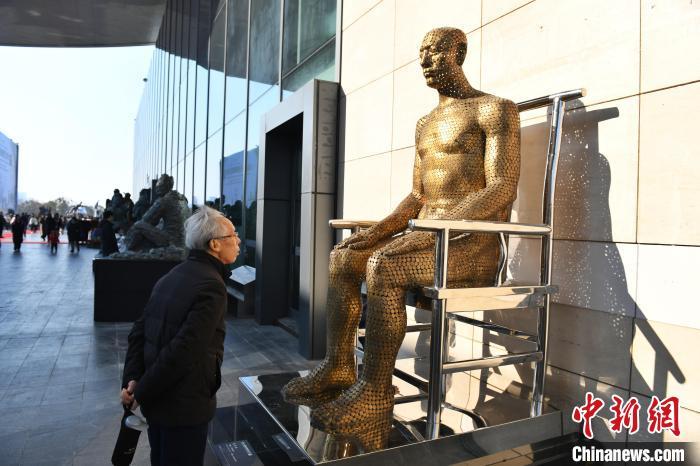 市民参观雕塑作品《临摹·王的坐姿》。 中新网记者 杨华峰 摄