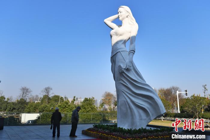 市民参观9米高的雕塑《湘女》。 中新网记者 杨华峰 摄