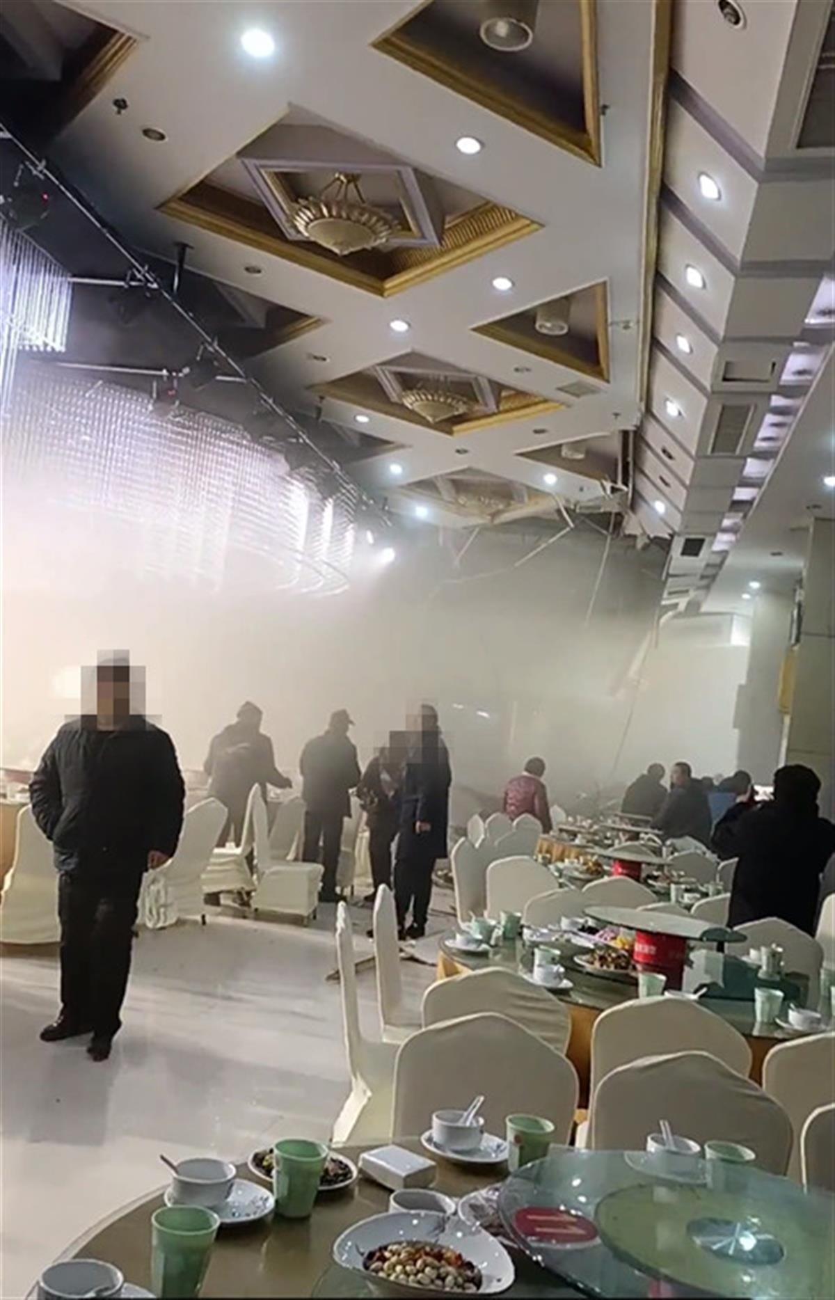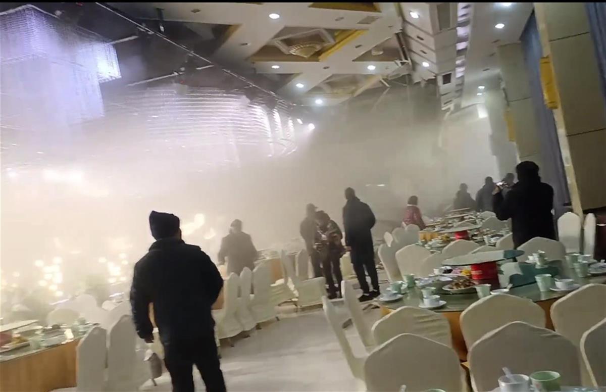 网络视频显示,一家酒店的宴会大厅内灰尘弥漫,人群惊慌失措,酒店门口驶来消防救援车、警车和救护车。
