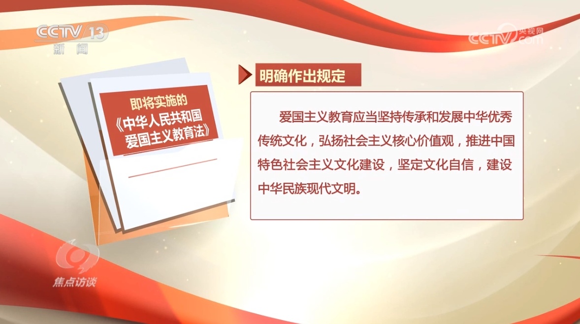 爱国主义自古以来就流淌在中华民族血脉之中,是我们民族精神的核心,是中国人民和中华民族同心同德、自强不息的精神纽带。推进爱国主义教育法治化,意味着爱国主义教育由“软性”的道德要求驱动,上升为了“刚性”的法律义务和责任驱动,这对传承和弘扬民族精神,凝聚人民力量,推进强国建设、民族复兴具有十分重大而深远的意义。就像我们在节目中看到的,因地制宜进行爱国主义教育,注重实效、融入日常,推动爱国主义教育广泛深入开展,才能充分体现立法的效果。