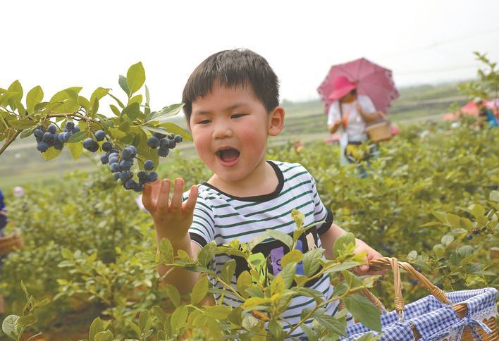 小朋友体验蓝莓采摘乐趣。