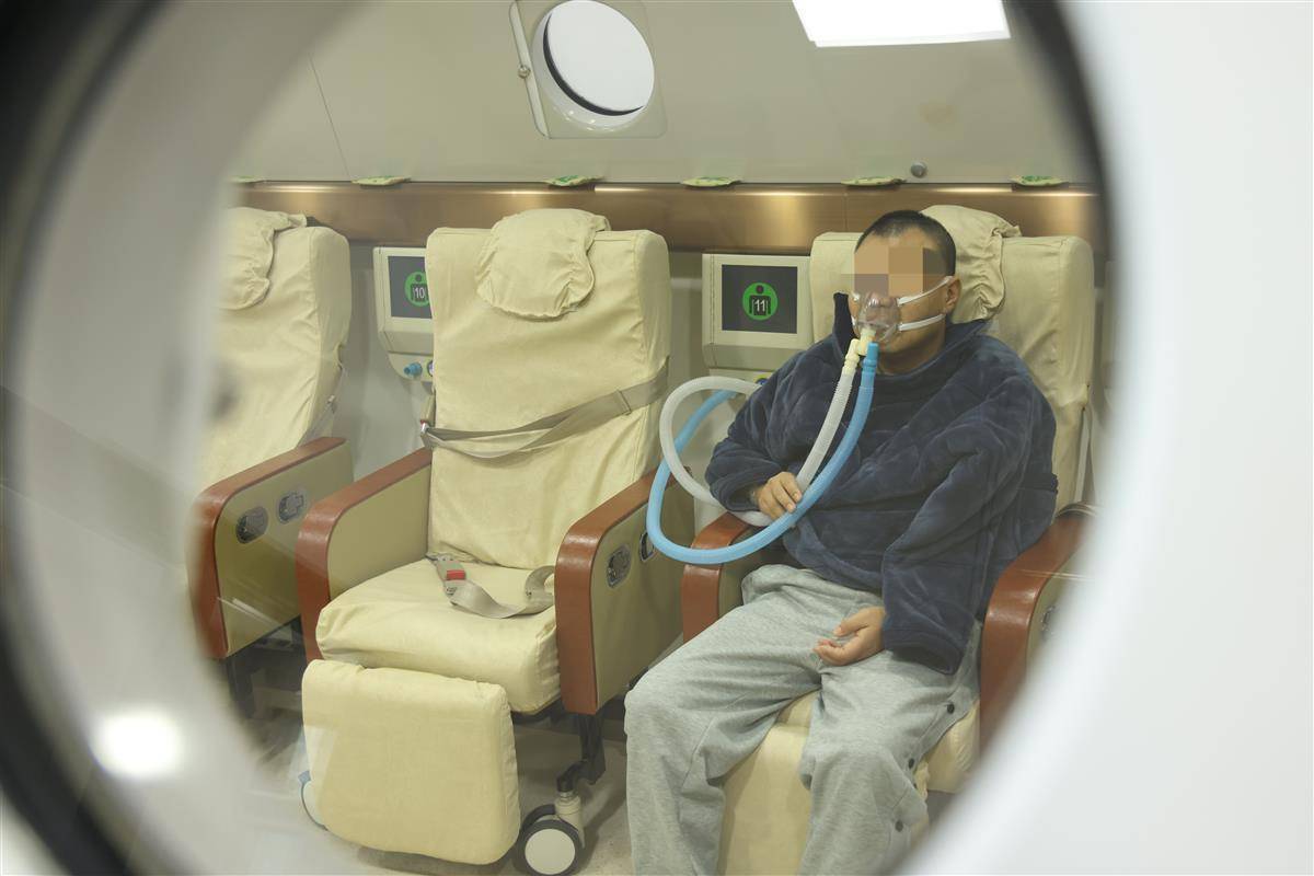 12月25日,赵先生来到杨春湖院区高压氧治疗中心接受了高压氧治疗。在高压氧舱内,透过监控屏幕可以看见,赵先生眼睛微闭,平静地坐在椅子上,佩戴面罩进行治疗。整个治疗过程约105分钟,分为升压、稳压吸氧、减压三个过程。治疗过程中,舱外的医生严密观察监控屏幕,通过多画面电视监视系统与他适时沟通。