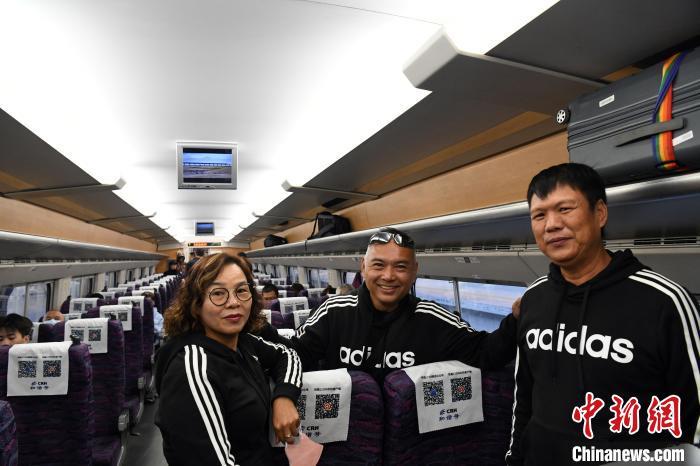 图为韦家胜(右一)、阮雪花、曾有胜(中)在首发列车上合影留念。 蒋雪林 摄
