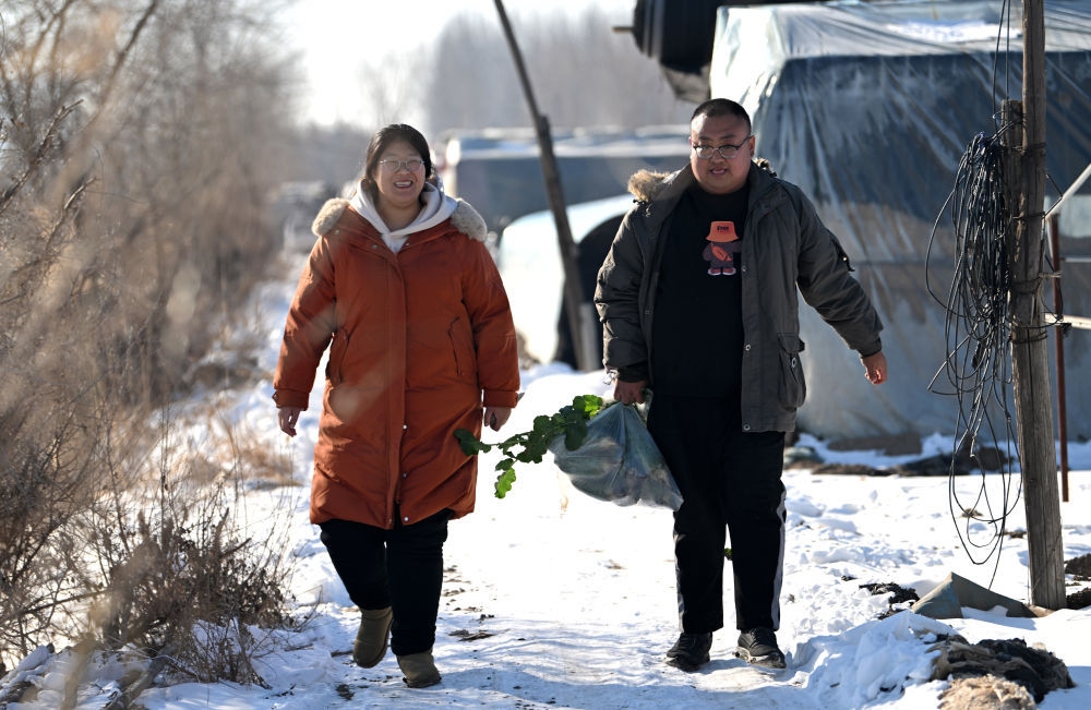 夫妻俩带着刚采摘的沙窝萝卜准备回去开播(12月22日摄)。新华社记者 李然 摄