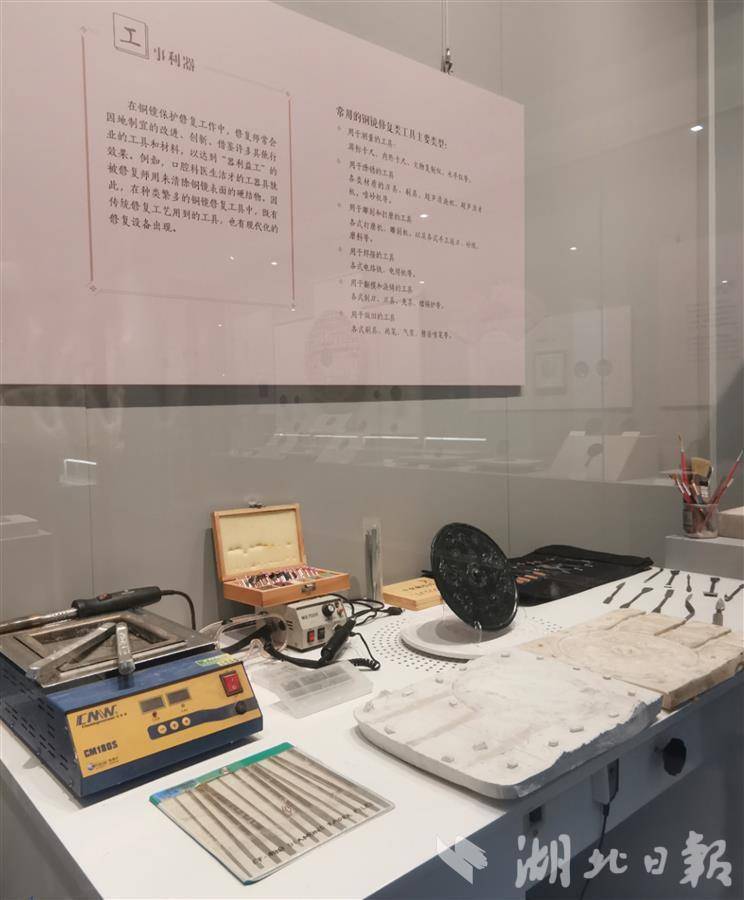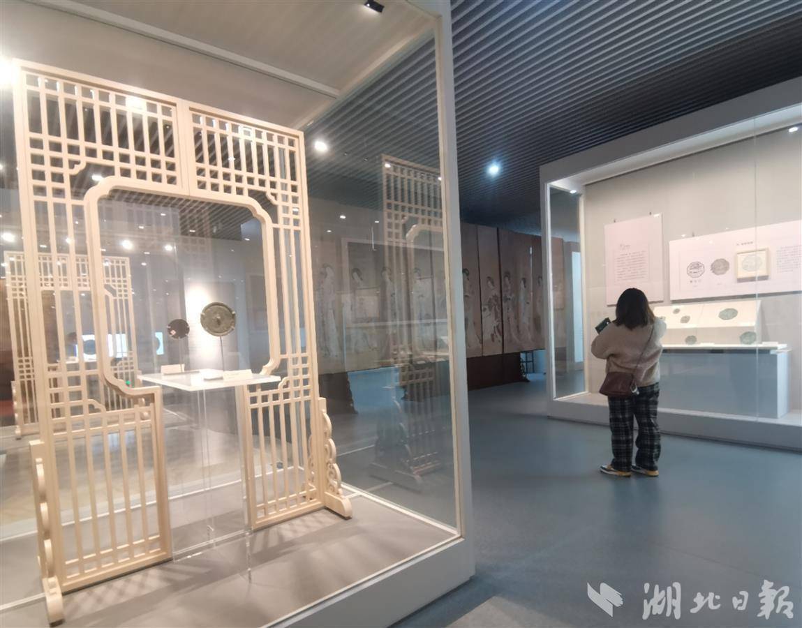 湖北日报全媒记者在展厅看到,展陈设计让人眼前一亮,策展团队不仅在展厅还原修复现场,还从古代书画中提取大量铜镜题材元素,运用到展板配色、辅助展品定制、场景复原、整体氛围把握等诸多方面,力求充分呈现中国传统文化的意蕴。