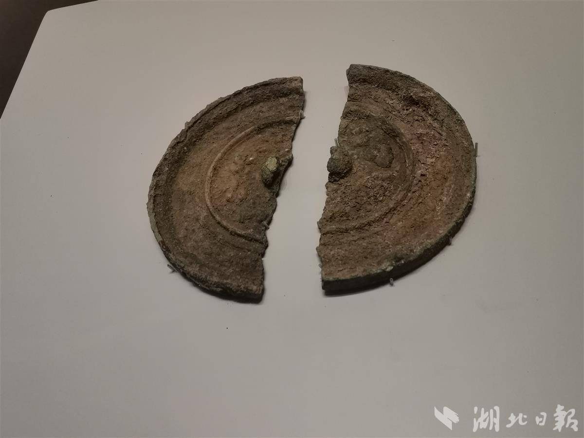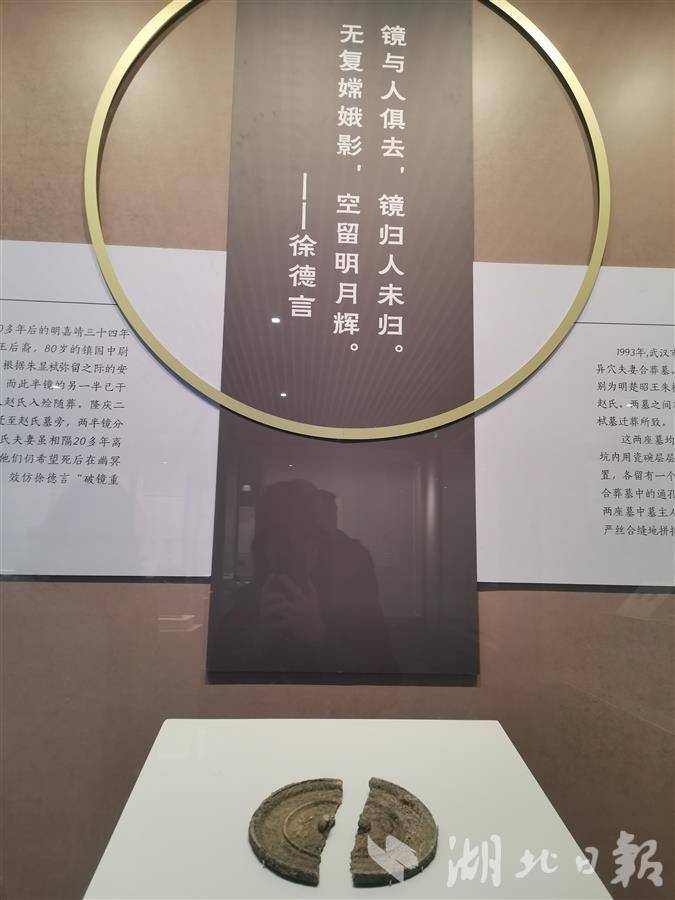 展品中,有一面断为两半的铜镜,上世纪八十年代出土于武汉市洪山区黄家湾的一座明代夫妻合葬墓中,墓主人为明太祖朱元璋第六世孙镇国中尉朱显栻及其妻。出土时,两块半镜分别位于男主人头部左侧和女主人头部右侧,这面铜镜是人为折断后再放入墓中的,寓意夫妇两人来世能“破镜重圆”、再续前缘,属于葬俗文化的一种。