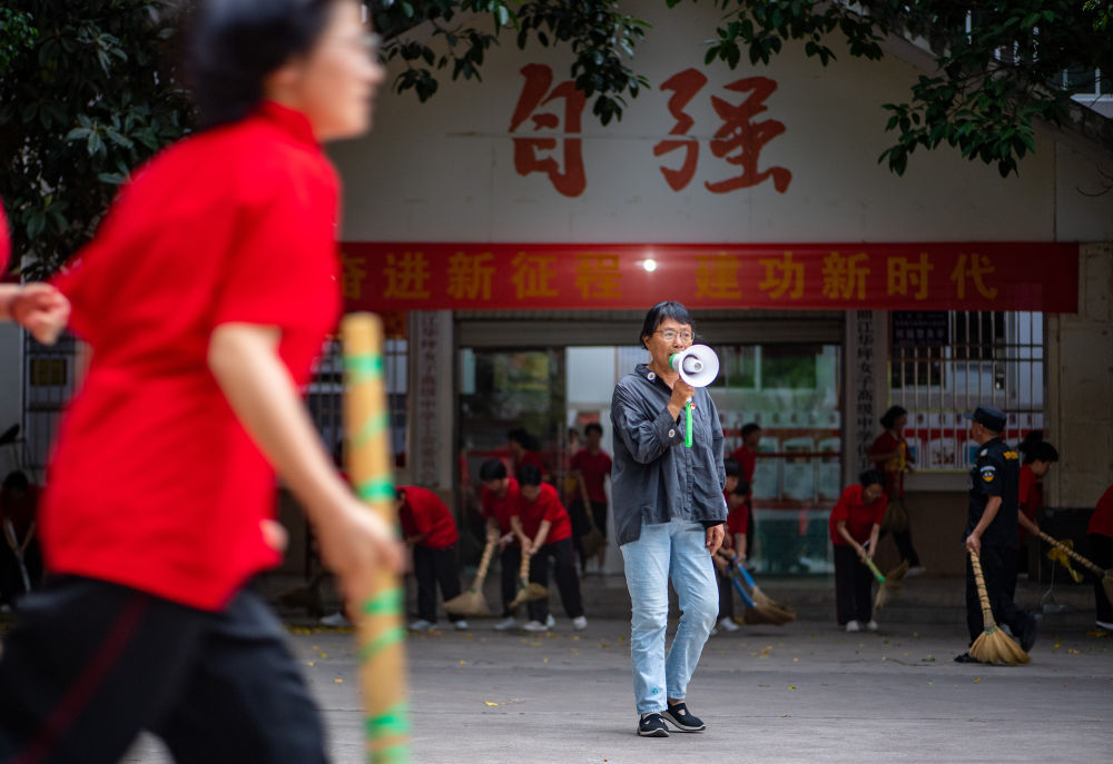 自云南丽江华坪女子高中的学生2011年首次参加高考以来,张桂梅校长每年都要送考,这一送就是13年。这是高考前一天,张桂梅(中)与学生们在一起(6月6日摄)。