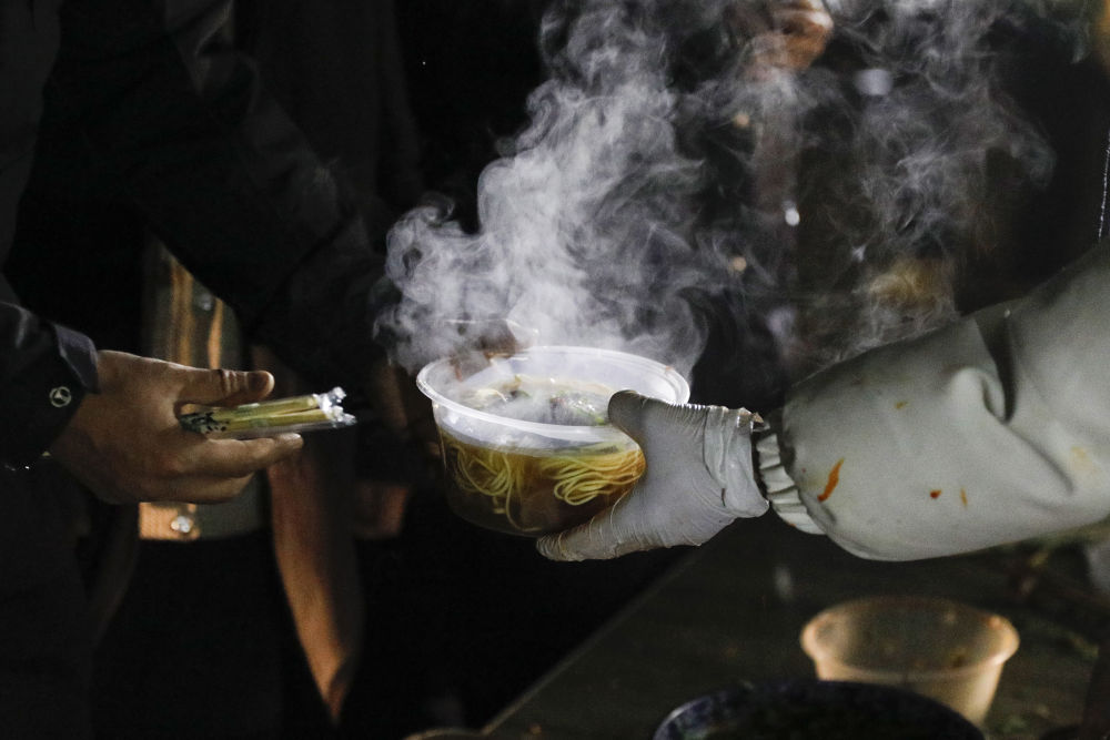 12月19日晚,在甘肃省临夏州积石山县大河家镇大河村安置点,受灾群众领取爱心牛肉面。