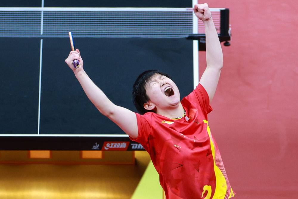 10月1日,孙颖莎在比赛后庆祝。当日,在杭州亚运会乒乓球项目女子单打决赛中,中国选手孙颖莎以4比1战胜日本选手早田希娜,夺得冠军。