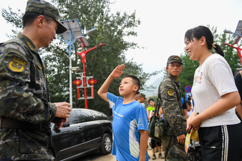 8月2日,在北京市门头沟区妙峰山镇,在乘坐车辆转移前,武天骐(中)向武警北京总队机动三支队的王雷鸣敬礼感谢。