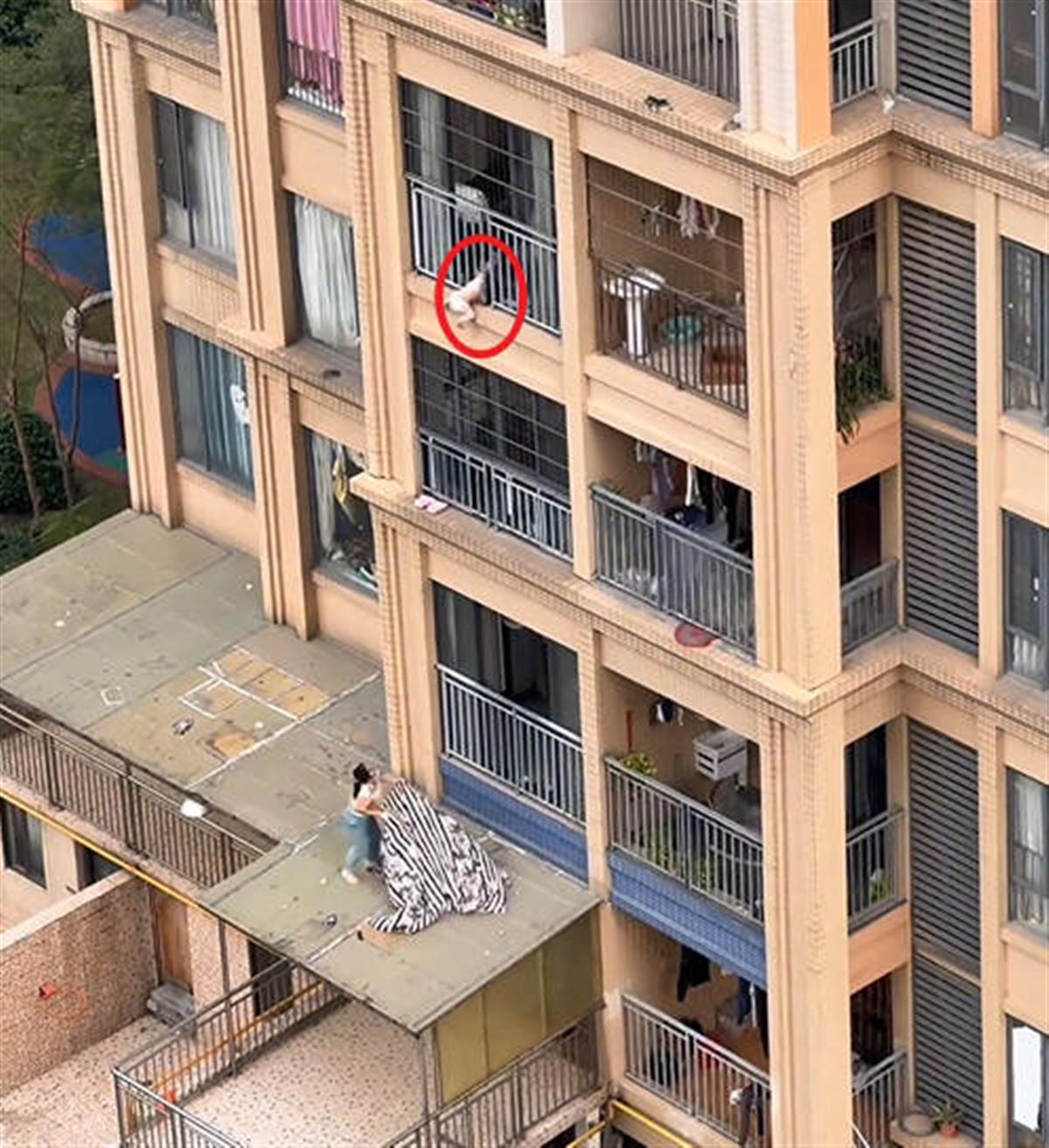视频显示,一栋居民楼的5楼阳台外,一名幼童头部卡在护栏处,整个身子悬空在外不断挣扎,其间险些从楼上掉下,让人揪心。一名男子从隔壁翻窗准备爬墙救人,还有女子从二楼顶棚拉开被子准备接住幼童。令人欣慰的是,最终有人进到了幼童所在房间,将其拉回室内。