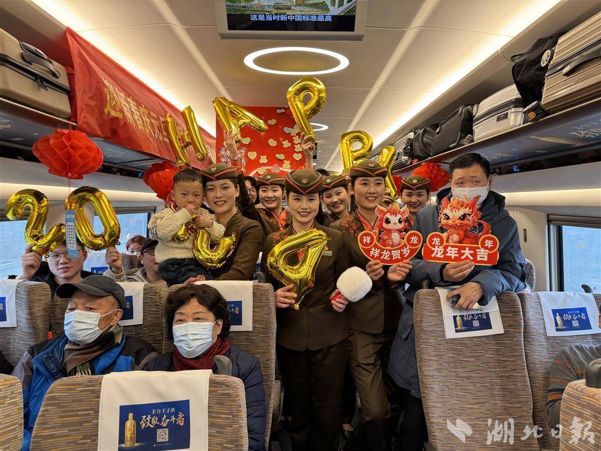 在汉口至重庆北的G3455次列车上,武汉客运段举办迎新年联欢活动,向旅客介绍“元旦”节日的由来和习俗,开展古诗词背诵和猜灯谜游戏,为获奖的旅客送上精美小礼品。列车乘务员与旅客一起剪窗花、贴窗花,在心愿墙上写下对新年的美好期待和祝福。