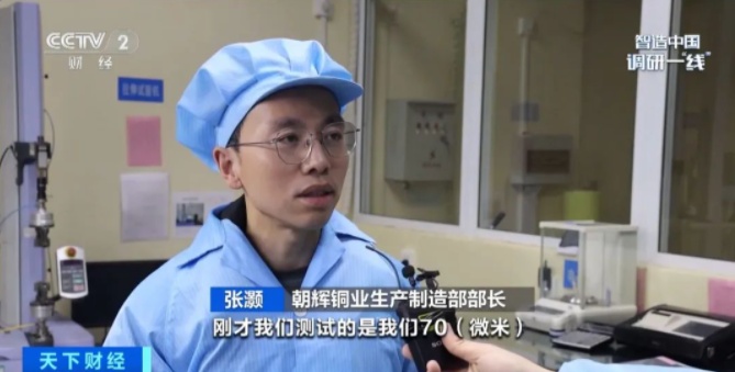 朝辉铜业生产制造部部长 张灏:测试的70微米航天航空专用的软态铜箔,它的特性是高延伸率、高耐弯折。现阶段我们生产重心、研发重心在黑化箔产品上,主要用在手机的领域,包括12微米、18微米的厚度。