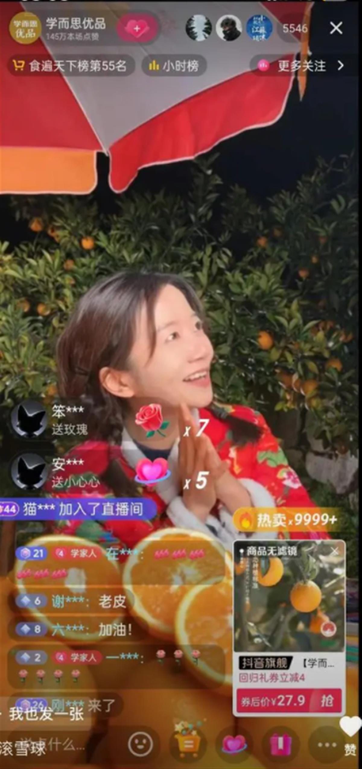 2023年12月31日,人气火爆的“学而思长公主”橙橙,回到家乡湖北开启助农直播,带货秭归脐橙,六个半小时销售超万单,创下学而思优品直播间单品销量纪录。面对这个成绩,橙橙在直播镜头前流下眼泪。(据2024年1月1日极目新闻)