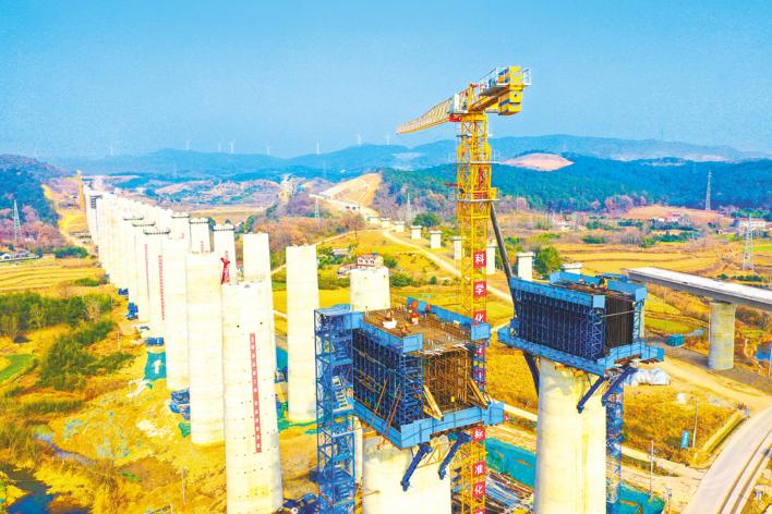 这是中铁十五局襄荆高铁XJZQ-4标段荆门施工现场。当日下午2时许,湖北日报全媒记者看到,两排高耸入云的墩柱不断向远方延伸,巨大的钢构件由吊车缓缓升起,精准地安装在墩柱上。桥梁、隧道及路基施工处,工人们在各自岗位上有序忙碌着,各种敲击声、机器的轰鸣声此起彼伏。(下图)