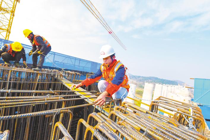 1月1日,襄荆高铁跨国道G347特大桥46米高的连续梁上,23岁的党员许雷雷手拿卷尺,测量模板内钢筋间距,把控着焊接、安装的细节。(上图)