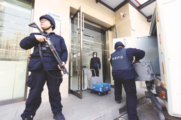 1月1日8时许,押运员准时将现金安全送达洪山区某银行营业厅。(湖北日报全媒记者 柯皓 摄)