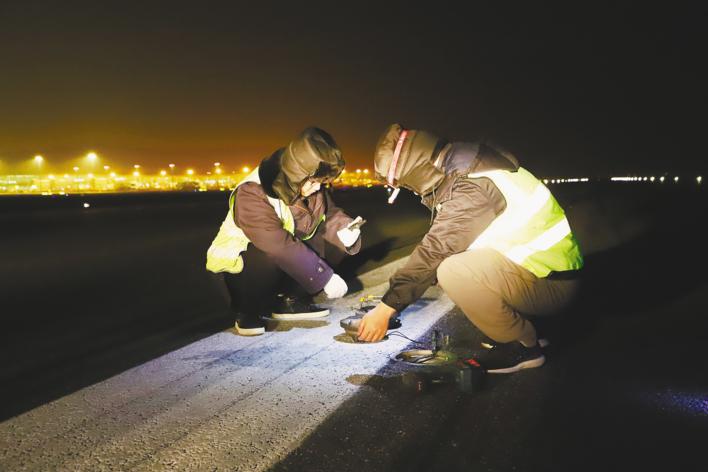 1月1日凌晨,天河机场助航灯光机务员正在更换跑道中线灯。