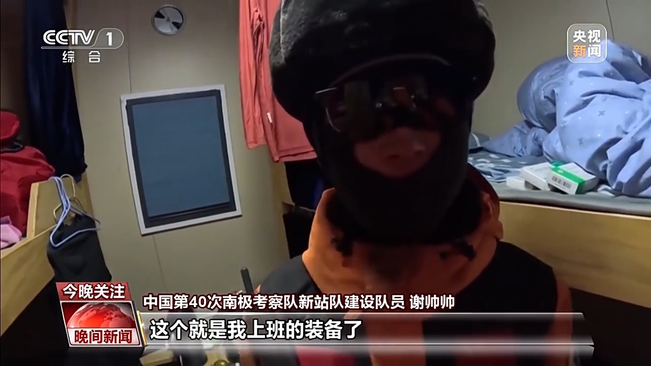 中国第40次南极考察队新战队建设队员 谢帅帅:戴个面罩、帽子、皮的安全帽,夹片往眼镜上一夹,这个就是我上班的装备了。我工作的地方,距离地面最高有近20米。我看过建成后的效果图了,特别漂亮,这是我干过最重大、最有意义的工程了。