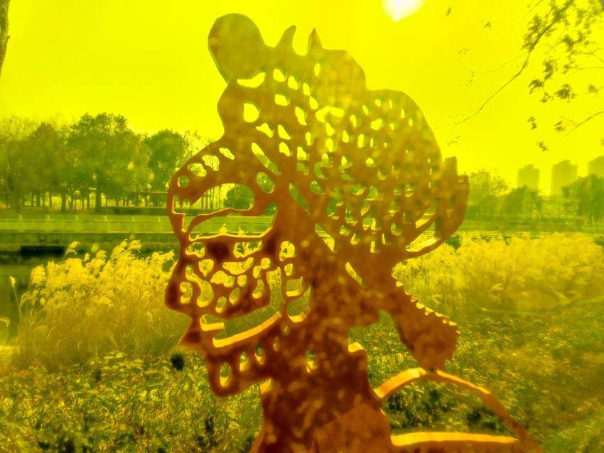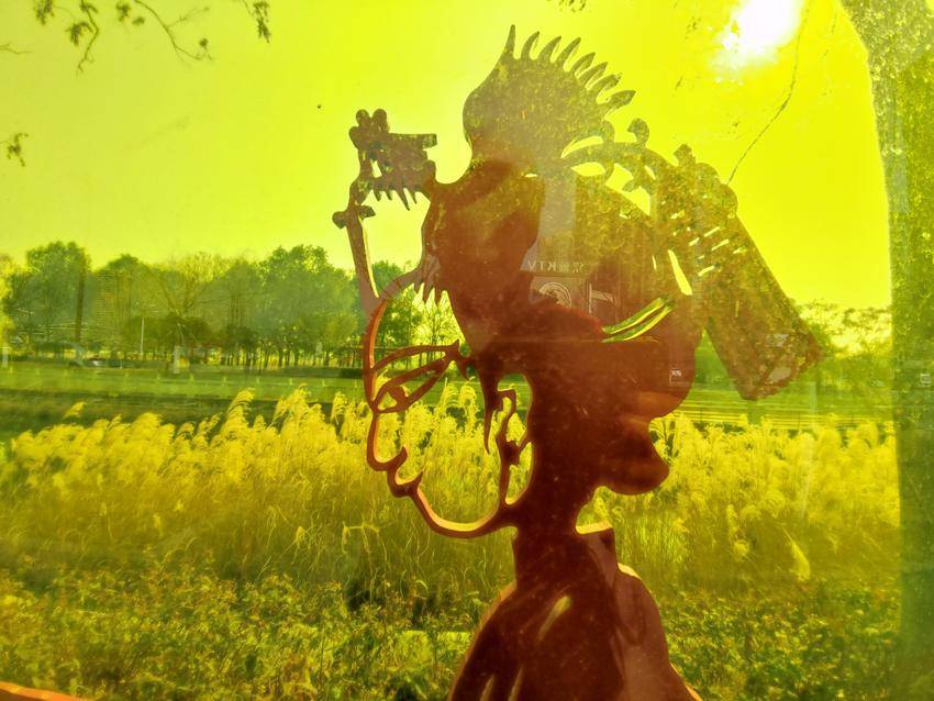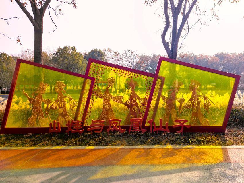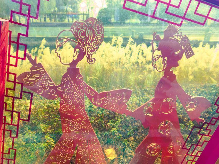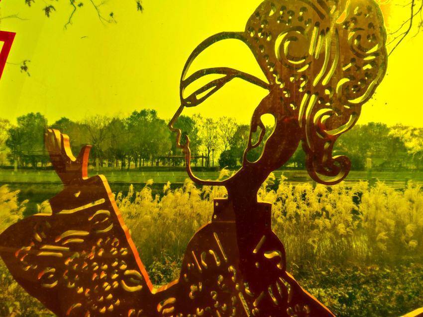 图为路边雕像“云梦皮影”。