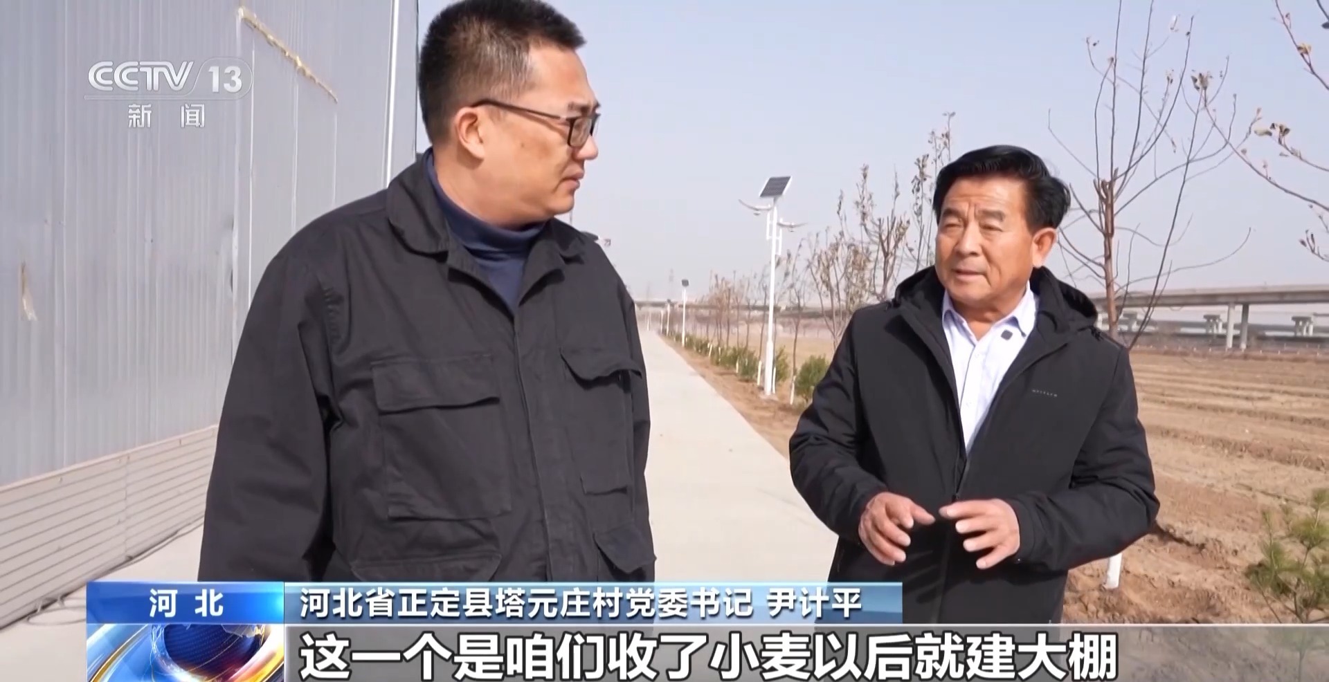 河北省正定县塔元庄村党委书记 尹计平:这是咱们在其他村庄做的农业大棚,咱们收了小麦以后就建大棚,利用了几个月的时间,一共建了这边是20个,路西的是20多个。