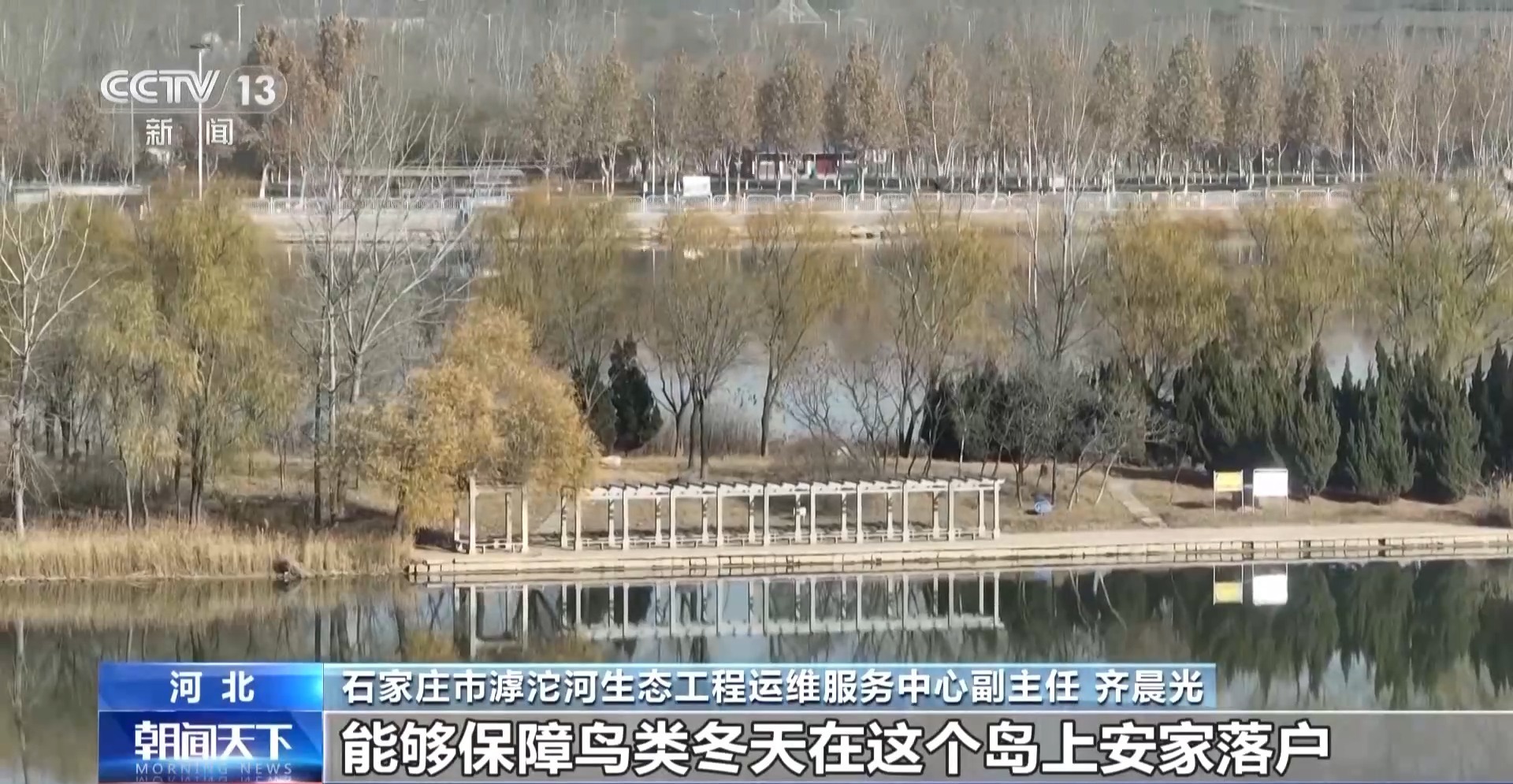 石家庄市滹沱河生态工程运维服务中心副主任 齐晨光:考虑到冬季结冰,我们在生态鸟岛上进行了提升改造。设置了多处小型的池塘,并做了保温措施,能够保障鸟类冬天在这个岛上安家落户。
