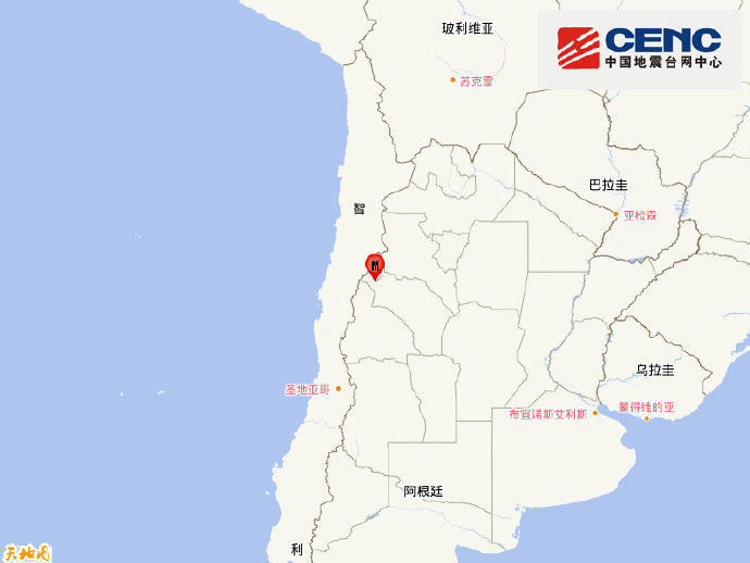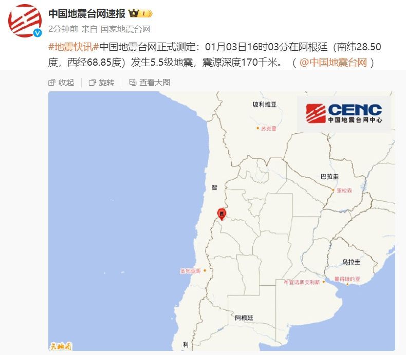 中国地震台网正式测定:1月3日16时03分在阿根廷(南纬28.50度,西经68.85度)发生5.5级地震,震源深度170千米。