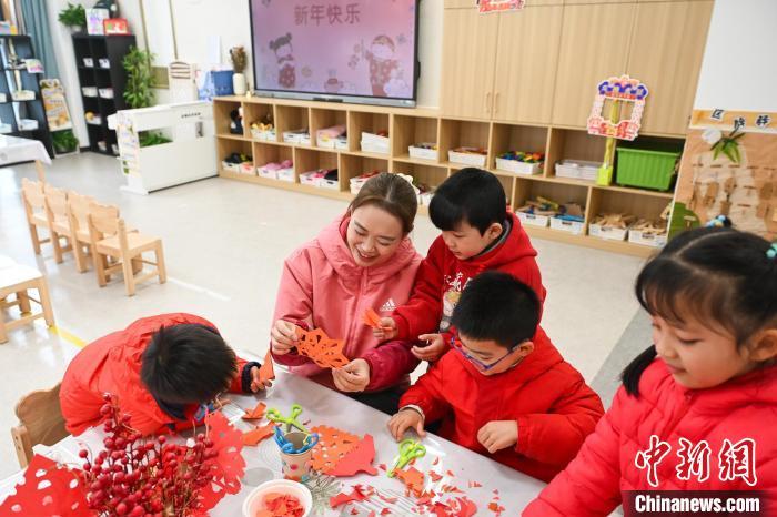 1月3日,新城时光幼儿园,小朋友们在老师的指导下剪纸。中新网记者 何蓬磊 摄